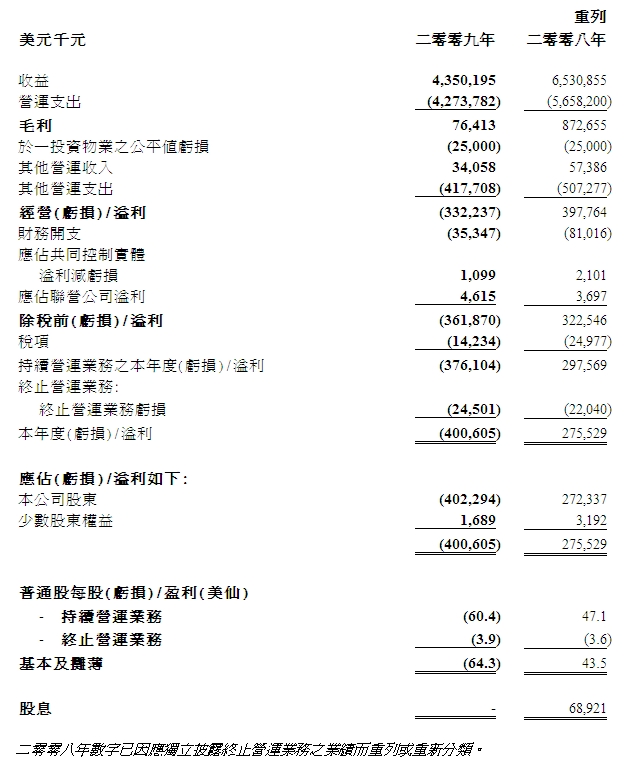 · 二零零九年撇除終止營運業務每股虧損60.4美仙,比對二零零八年為每股溢利47.1美仙