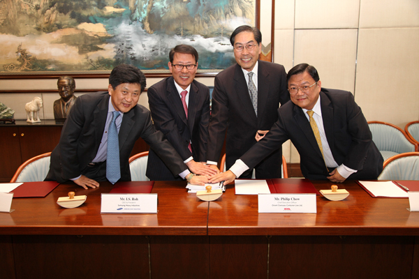 上图 (左至右): 三星重工专务兼营业总监, 金正国先生; 东方海外国际主席及行政总裁, 董建成先生; 三星重工代表理事兼社长, 鲁寅直先生; 东方海外行政总裁, 邹耀华先生。