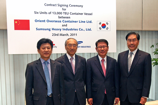 东方海外今天与三星重工签约订购六艘可载运13,000 个标准箱的集装箱货轮。是次签约标记着东方海外首次订购该种巨形货轮。订购这批新货轮可进一步证明东方海外对投放巨额资产投资的决心和为客户提供更佳服务的承诺,并且在促进世界贸易的同时,亦可减低业务运作对环境的影响。