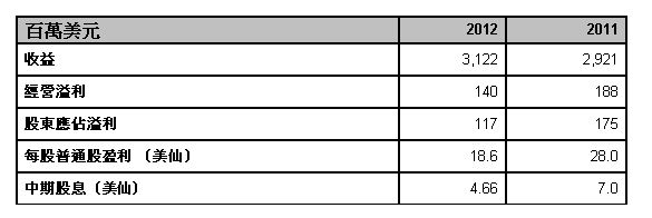 二零一二年上半年每股普通股盈利為18.6美仙,比對二零一一年上半年之每股普通股盈利為28.0美仙。
