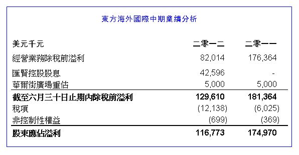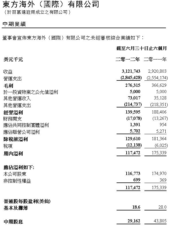東方海外(國際)有限公司及其附屬公司(本「集團」)今天公佈二零一二年六月三十日止六個月錄得股東應佔溢利一億一千六百八十萬美元,比對二零一一年同期溢利為一億七千五百萬美元。二零一二零年中期業績同比減少五千八百二十萬美元,即百分之三十三。