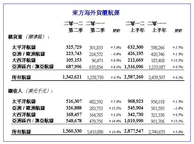 OOCL上半年總貨量及收入較二零一一年同期分別增加百分之六點一及百分之五。二零一一年下滑之平均收入自三月份開始止跌回升,於亞洲至歐洲航線尤為明顯。