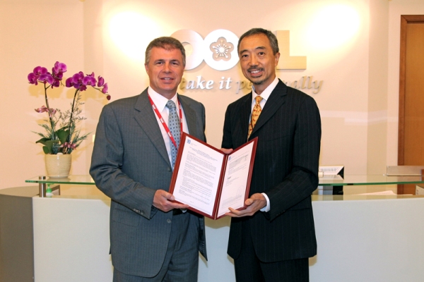 (右至左) 东方海外的航线贸易部董事,伍绍裘先生接受劳氏船级社亚洲,亚太区的总裁劳利先生所颁发的认证证书