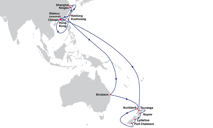 CNS的靠泊次序如下:上海 / 宁波 / 赤湾 / 高雄 / 布利斯班 / 奥克兰 / 查默斯港(Port Chalmers) / 利特尔顿(Lyttelton) / 内皮尔(Napier) / 陶朗阿(Tauranga) / 香港 / 蛇口(随季节调整) / 基隆 / 上海