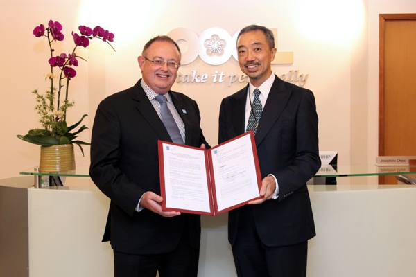 (右-左) 东方海外的航线贸易部董事伍绍裘先生接受劳氏质量认证有限公司(LRQA) 的全球市场营销策略主管毕泰斯先生(Simon Batters) 所颁发的鉴定证书