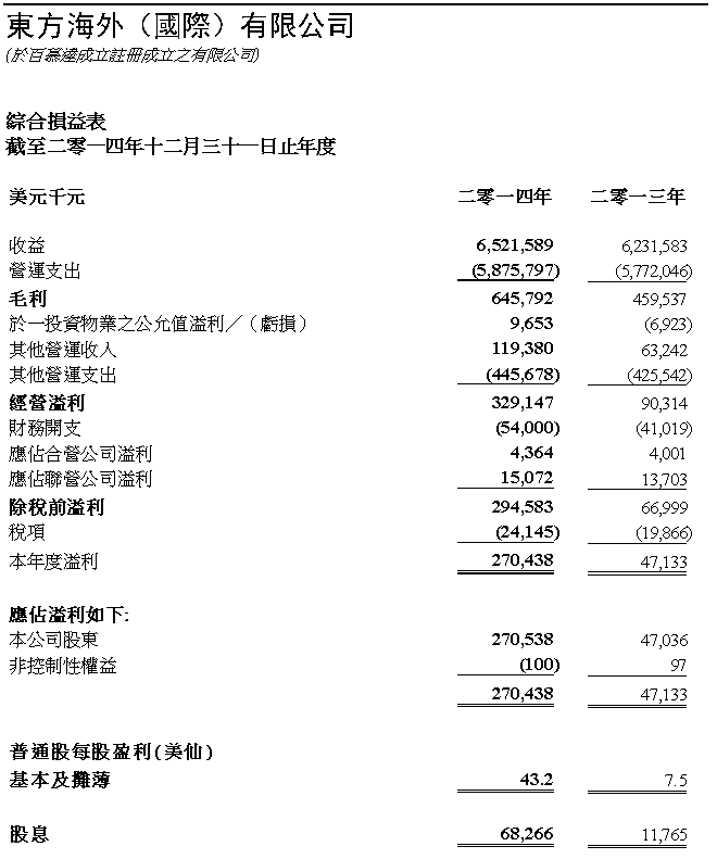 東方海外(國際)有限公司(「東方海外國際」)今天宣布截至二零一四年十二月三十一日止年度錄得股東應佔溢利二億七千零五十萬美元,比對二零一三年溢利四千七百萬美元。