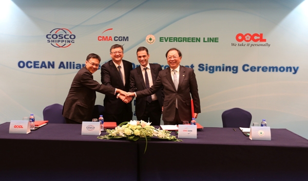 (上海) 海洋联盟的四家成员,中远集运、达飞轮船、长荣海运和东方海外今天在上海签署了联盟的服务航线产品清单,详细胪列海洋联盟所拟定的服务网络,其中包含了各条航线的挂港次序。
