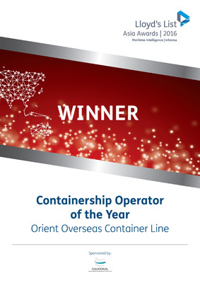 东方海外很荣幸于十月二十日在新加坡举行的「劳氏亚洲年度大奖」颁奖典礼中,在众多同业前,获颁发「年度最佳亚洲集装箱运输营运商大奖」 (Lloyd’s List Asia Containership Operator of the Year Award)。