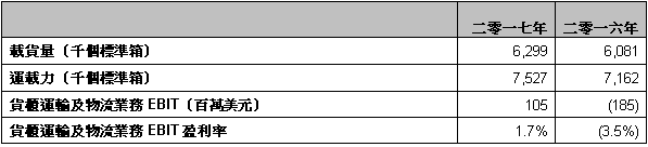 • 東方海外國際旗下之貨櫃運輸及物流業務錄得EBIT一億零五百萬美元,盈利率約百分之一點七。