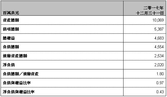 集團財務總裁董立新先生表示:「於二零一七年十二月三十一日,集團持有速動資產餘額達二十五億三千四百五十萬美元,而需於二零一八年償還之債項則為六億二千四百二十萬美元。二零一七年底時淨負債與股東權益比率為0.43 : 1。集團繼續專注於維持資本結構之可持續性,確保擁有最大之主動權及彈性作為競爭優勢。集團致力於在足夠流動資金、高效資本結構及股東回報之間保持平衡,無懼經濟及市場週期起伏。」