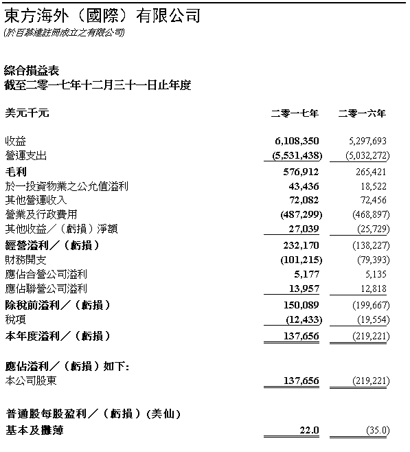 東方海外國際公佈二零一七年度全年業績