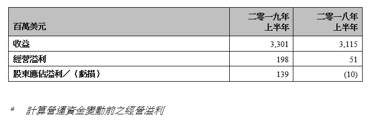 二零一九年上半年每股普通股盈利二十二點二美仙,比對二零一八年上半年之每股普通股虧損一點六美仙。