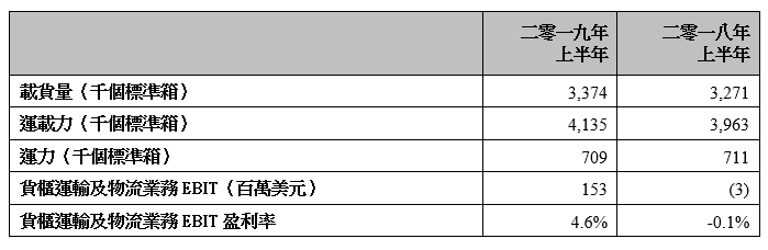 二零一九年上半年物流業務收益及盈利貢獻較去年同期分別下降百分之二點一及百分之六點九。國際供應鏈管理服務盈利貢獻下降百分之二點九,乃因部分主要零售客戶規模下滑所致。進出口業務盈利貢獻下降百分之四點五。堆場業務盈利貢獻下跌百分之二十一點五,乃因費率下調所致。替換虧損客戶的過渡期間現有倉庫使用率下降、設立新倉庫的大額啟動成本以及運輸業務激烈的壓價競爭,均為構成本土物流業務盈利貢獻下跌百分之十六的主要因素。