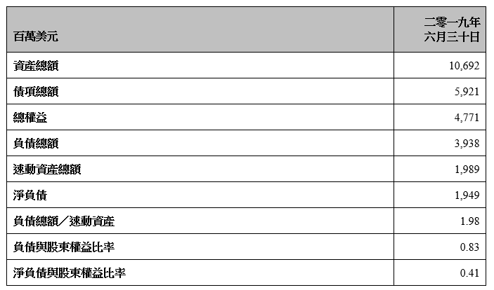 • 於二零一九年六月三十日時速動資產為二十億美元