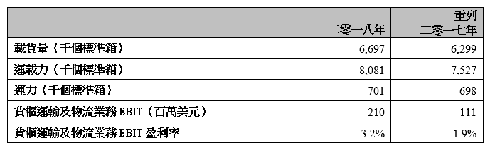 與二零一七年相仿,二零一八年東方海外貨櫃錄得強勁增長,亞歐航線及太平洋航線表現尤為突出。集團二零一八年全年整體載貨量上升6.3%,而太平洋航線及亞歐航線更是分別上升8.9%及14.5%,連續兩年高過市場整體貨量升幅。