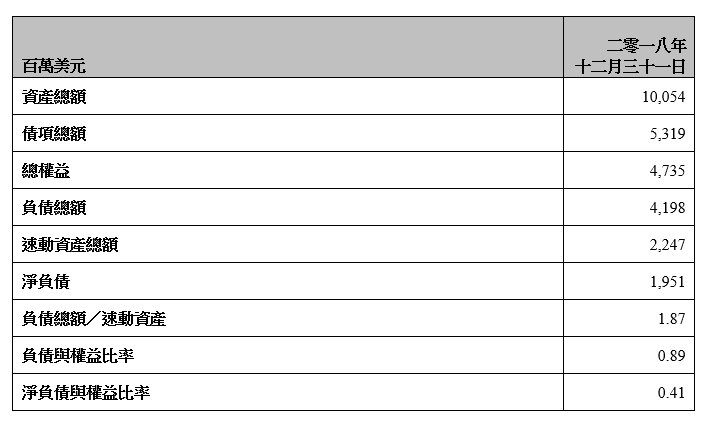 於二零一八年十二月三十一日,集團持有速動資產餘額達二十二億四千六百八十萬美元,而需於二零一九年償還之債項則為五億零一百九十萬美元。二零一八年底時淨負債與股東權益比率為0.41 : 1。集團定期編製及更新現金流量預測,監察因購置資產、發展項目及流動資金所需之頭寸,確保將多餘資金有效投資之餘,仍能保持平穩之資金週轉水準。