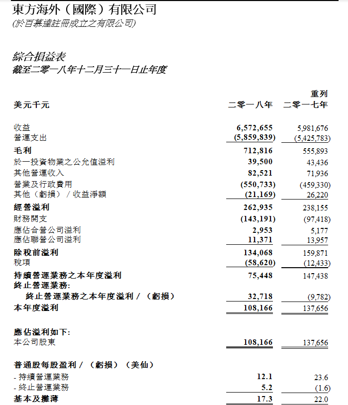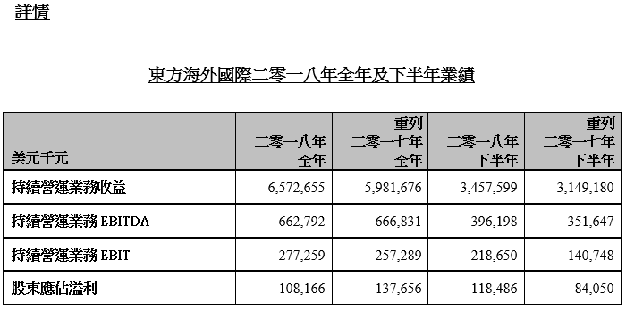 東方海外(國際)有限公司(「東方海外國際」)及其附屬公司(「本集團」)今天宣布截至二零一八年十二月三十一日止年度錄得股東應佔溢利一億零八百二十萬美元,比對二零一七年溢利一億三千七百七十萬美元。