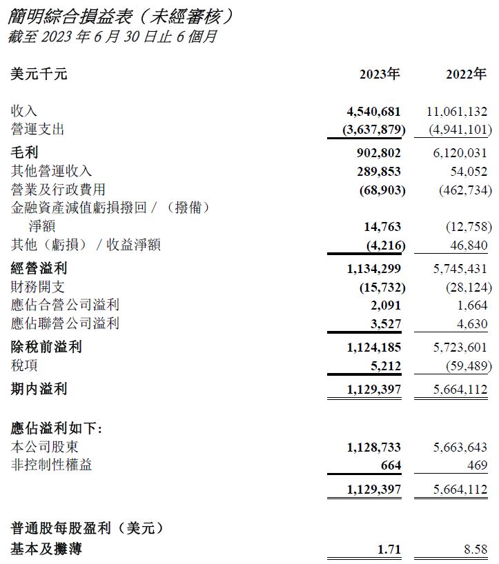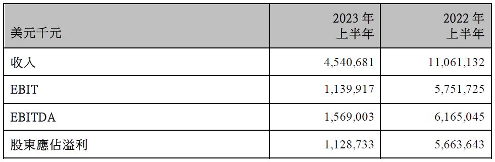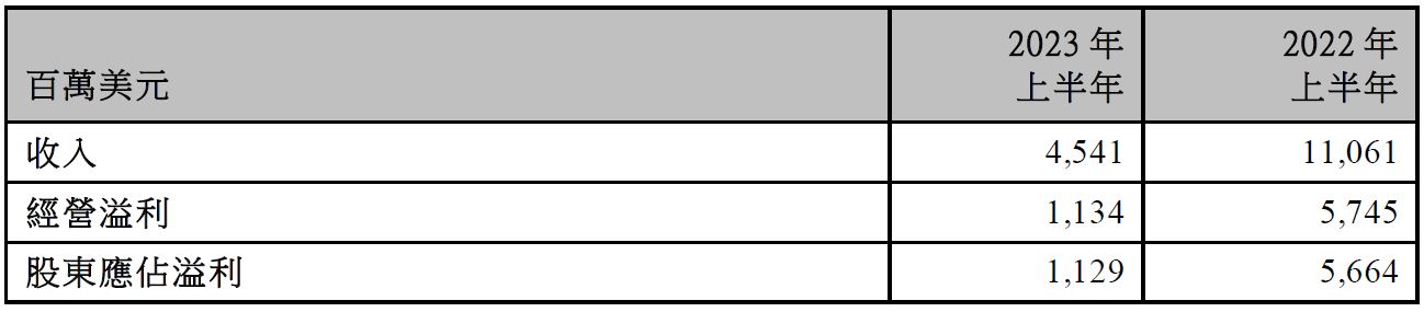 2023年上半年普通股每股盈利1.71美元,比對2022年上半年之普通股每股盈利8.58美元。