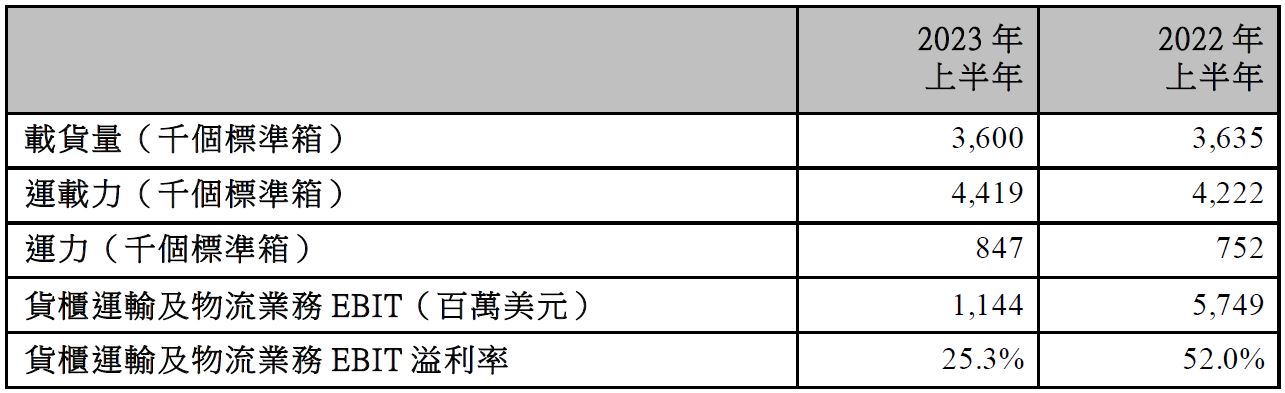 因此,與2022年同期相比,東方海外航運於2023年上半年總體貨運量減少1%,總收入下降60%,致使每個標準箱平均收入減少60%。