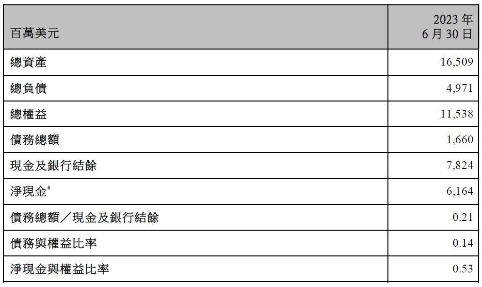 於2023年6月30日,集團持有現金及銀行結餘達78.24億美元,而需於一年内償還之債項則為5.97億美元。於2023年6月30日,集團維持淨現金狀況,淨現金與權益比率為0.53 : 1。集團定期編製及更新現金流量預測,監察因購置資產、發展項目及流動資金所需之頭寸,確保將多餘資金有效投資之餘,仍能保持平穩之資金週轉水準。