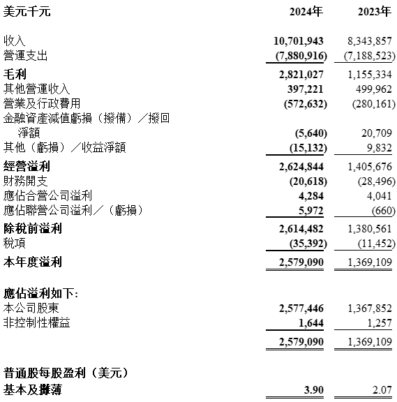 2024年度普通股每股盈利3.90美元,2023年則為每股盈利2.07美元。