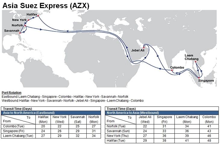 - Asia Suez Express (AZX): Laem Chabang – Singapore – Colombo – Suez Canal – Halifax – New York – Savannah – Norfolk – Suez Canal – Jebel Ali – Singapore – Laem Chabang