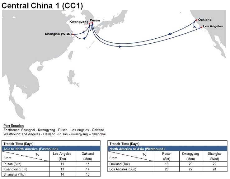- Central China 1 (CC1): Shanghai (Waigaoqiao) – Kwangyang – Pusan – Los Angeles – Oakland – Pusan – Kwangyang – Shanghai