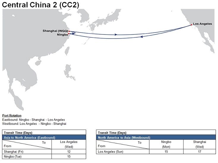 - Central China 2 (CC2): Ningbo – Shanghai (Waigaoqiao) – Los Angeles – Ningbo