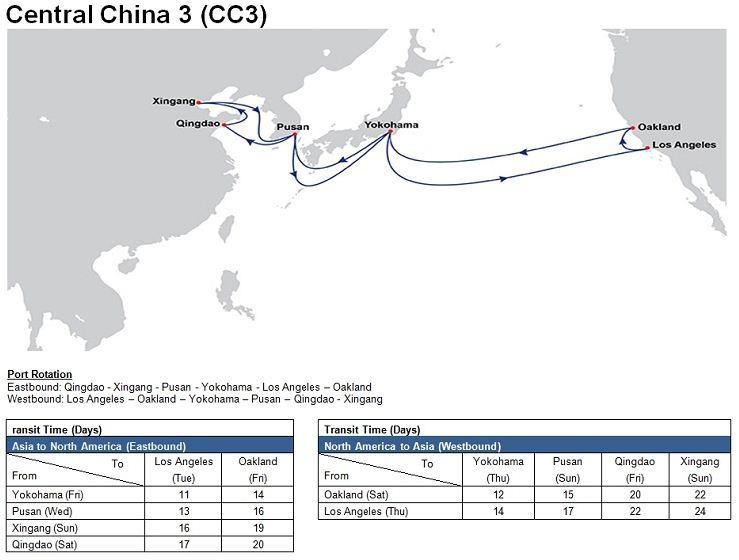 - Central China 3 (CC3): Qingdao – Xingang – Pusan – Yokohama – Los Angeles – Oakland – Yokohama – Pusan – Qingdao