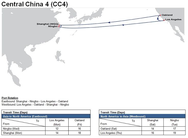 - Central China 4 (CC4): Shanghai (Waigaoqiao) – Ningbo – Los Angeles – Oakland – Shanghai