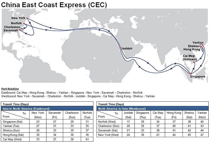 - China East Coast Express (CEC): Cai Mep – Hong Kong – Shekou – Yantian – Singapore – Suez Canal – New York – Savannah – Charleston – Norfolk – Suez Canal – Jeddah – Singapore – Cai Mep