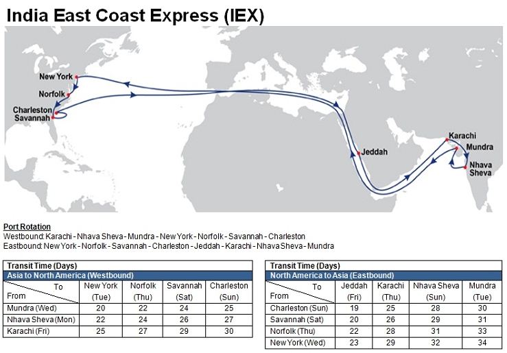 - India East Coast Express (IEX): Karachi – Nhava Sheva – Mundra – Suez Canal – New York – Norfolk – Savannah – Charleston – Suez Canal – Jeddah – Karachi