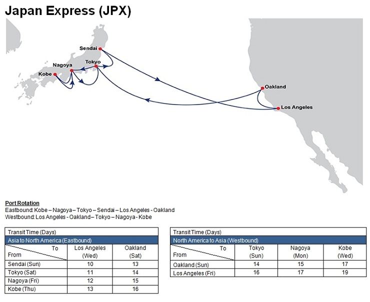 - Japan Express (JPX): Kobe – Nagoya – Tokyo – Sendai – Los Angeles – Oakland – Tokyo – Nagoya – Kobe