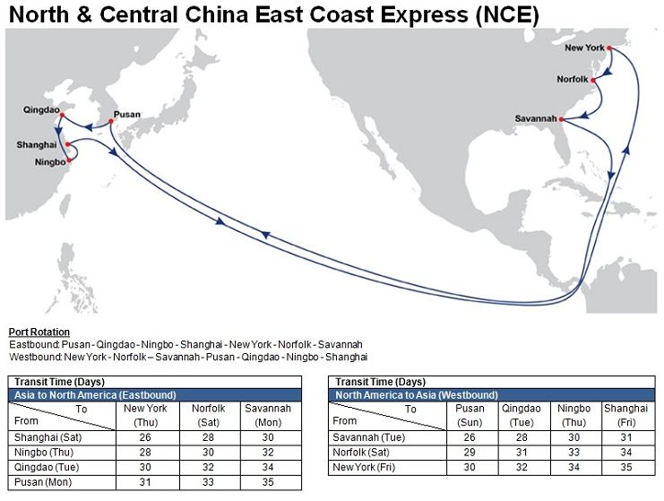 - North & Central China East Coast Express (NCE): Pusan – Qingdao – Ningbo – Shanghai (Yangshan) – Panama Canal – New York – Norfolk – Savannah – Panama Canal - Pusan