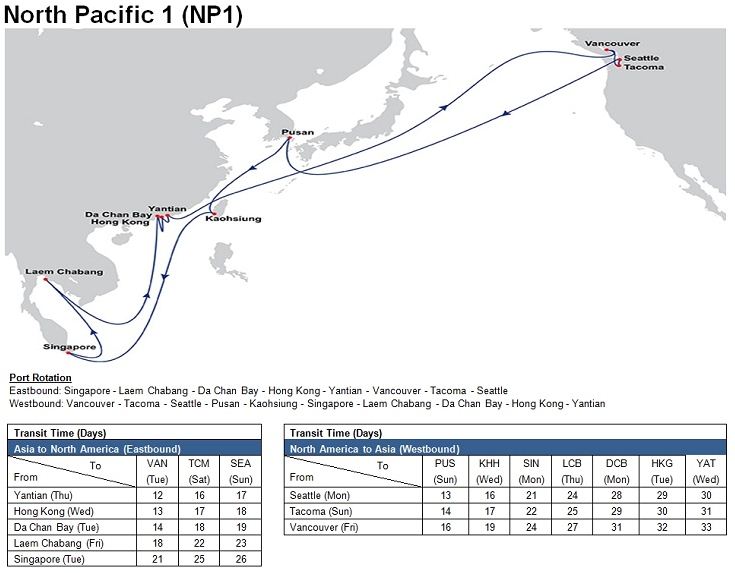 - North Pacific 1 (NP1): Singapore – Laem Chabang – Dachan Bay – Hong Kong – Yantian – Vancouver – Tacoma – Seattle – Pusan – Kaohsiung – Singapore