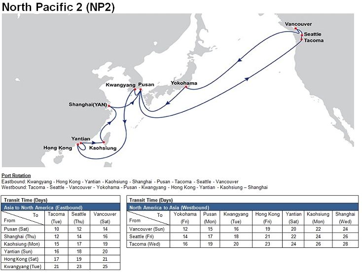 - North Pacific 2 (NP2): Hong Kong – Yantian – Kaohsiung – Shanghai (Waigaoqiao/Yangshan*) – Pusan – Tacoma – Seattle – Vancouver – Yokohama – Pusan – Kwangyang – Hong Kong