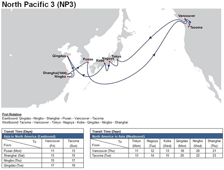 - North Pacific 3 (NP3): Qingdao – Ningbo – Shanghai (Yangshan) – Pusan – Vancouver – Tacoma – Vancouver – Tokyo – Nagoya – Kobe – Qingdao