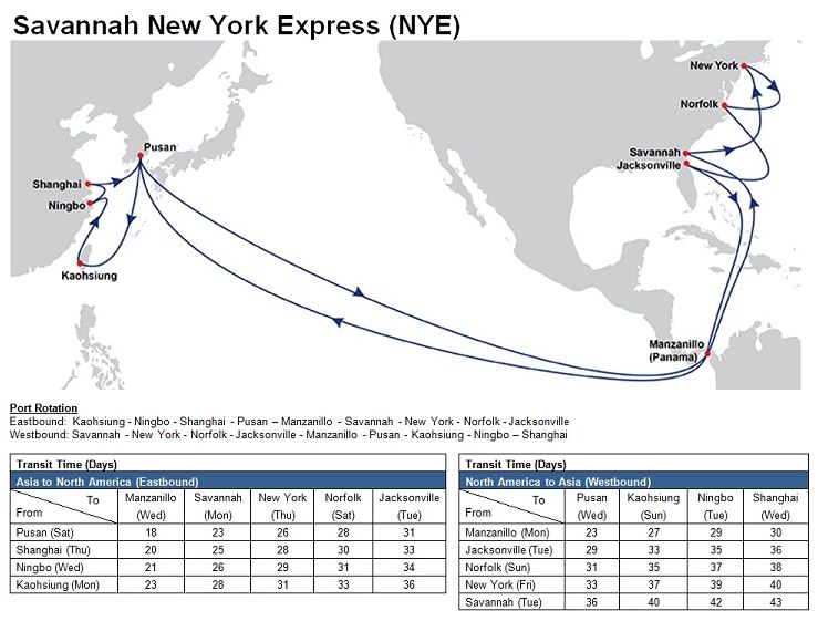 - New York Express (NYE): Kaohsiung – Ningbo – Shanghai (Yangshan) – Pusan – Panama Canal – Manzanilllo – Savannah – New York – Norfolk – Jacksonville – Manzanillo – Panama Canal – Pusan – Kaohsiung