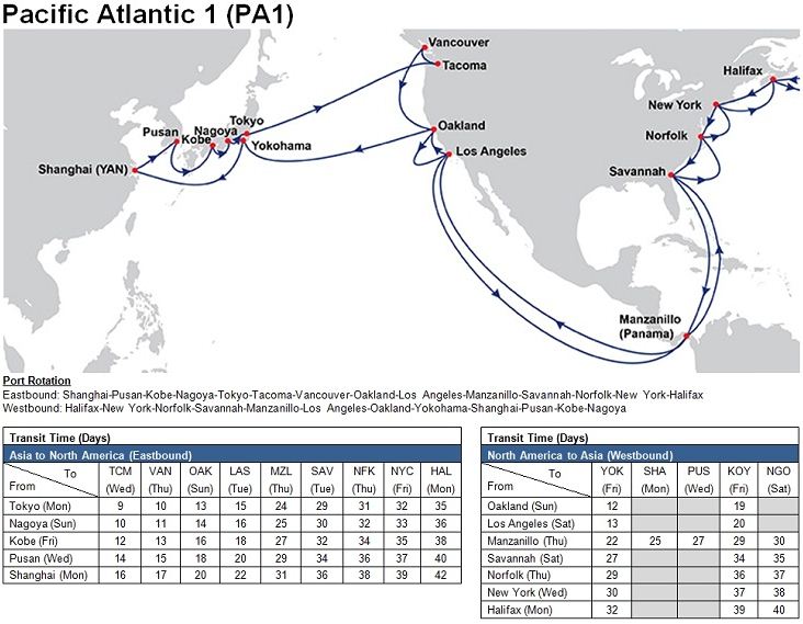 - Pacific Atlantic 1 (PA1): Shanghai (Yangshan) – Pusan – Kobe – Nagoya – Tokyo – Tacoma – Vancouver – Oakland – Los Angeles – Balboa – Panama Canal – Manzanillo, Panama – Savannah – Norfolk – New York – Halifax – Europe – Halifax – New York – Norfolk –Savannah – Manzanillo, Panama – Panama Canal – Los Angeles – Oakland – Yokohama – Shanghai