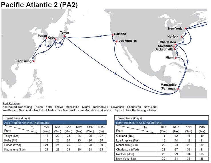 - Pacific Atlantic 2 (PA2): Kaohsiung – Pusan – Kobe – Tokyo – Balboa – Panama Canal – Manzanillo, Panama – Miami – Jacksonville – Savannah – Charleston – New York – Europe – New York – Norfolk – Charleston – Manzanillo, Panama – Panama Canal – Balboa – Los Angeles – Oakland – Tokyo – Kobe – Kaohsiung