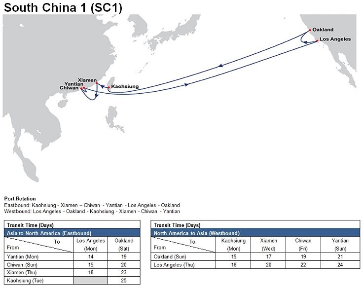 - South China 1 (SC1): Xiamen – Chiwan – Yantian – Los Angeles – Oakland – Kaohsiung – Xiamen