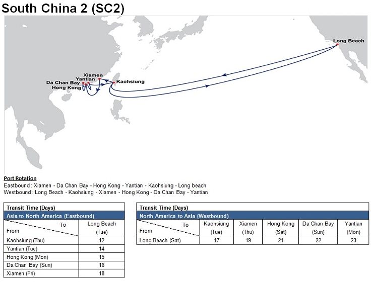 - South China 2 (SC2): Dachan Bay – Hong Kong – Yantian – Kaohsiung – Long Beach – Kaohsiung – Xiamen - Hong Kong – Dachan Bay