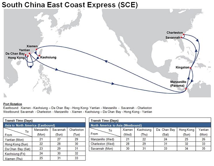 - South China East Coast Express (SCE): Xiamen – Kaohsiung – Dachan Bay – Hong Kong – Yantian – Panama Canal – Manzanillo – Kingston – Savannah – Charleston – Kingston – Manzanillo – Panama Canal – Xiamen