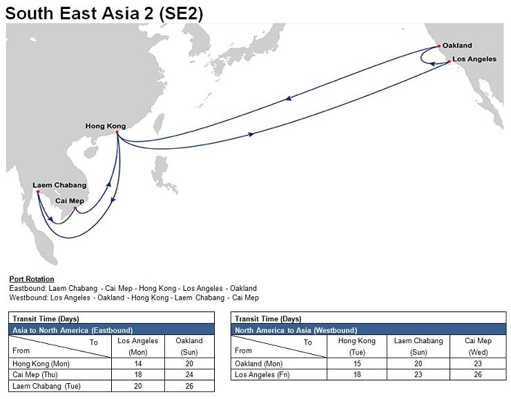 - South East Asia 2 (SE2): Laem Chabang – Cai Mep – Hong Kong – Los Angeles – Oakland – Hong Kong – Laem Chabang