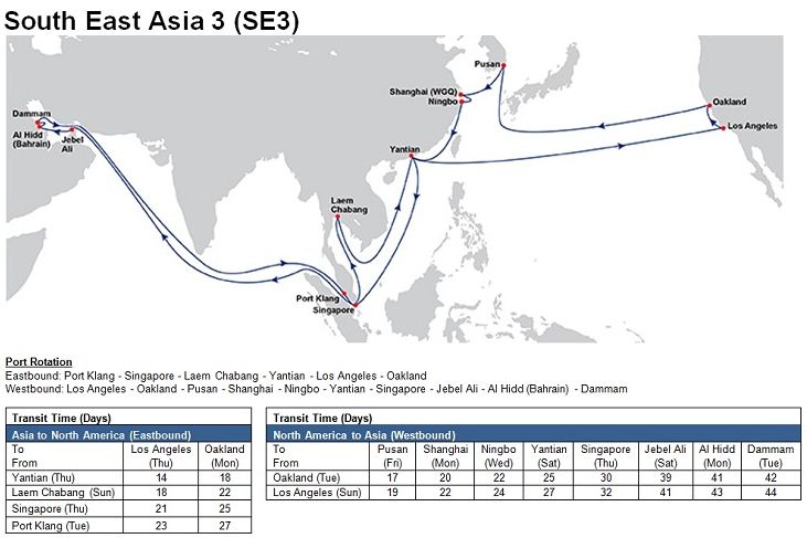 - South East Asia 3 (SE3): Jebel Ali – Al Hidd – Dammam – Port Klang - Singapore – Laem Chabang – Yantian – Los Angeles – Oakland – Pusan – Shanghai (Waigaoqiao) – Ningbo – Yantian –Singapore – Jebel Ali